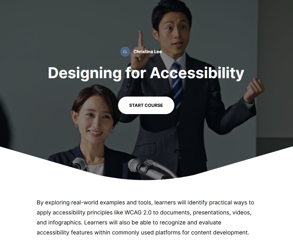 This course was created to explore and demonstrate how accessibility and inclusivity can be intentionally woven into instructional design. Developed in Rise 360, it reflects not only foundational principles—such as Universal Design for Learning, the POUR framework, and WCAG guidelines—but also my personal growth as a designer committed to creating equitable learning experiences. Through a blend of historical context, practical application, and reflective practice, the course highlights the importance of designing with empathy, clarity, and consistency.